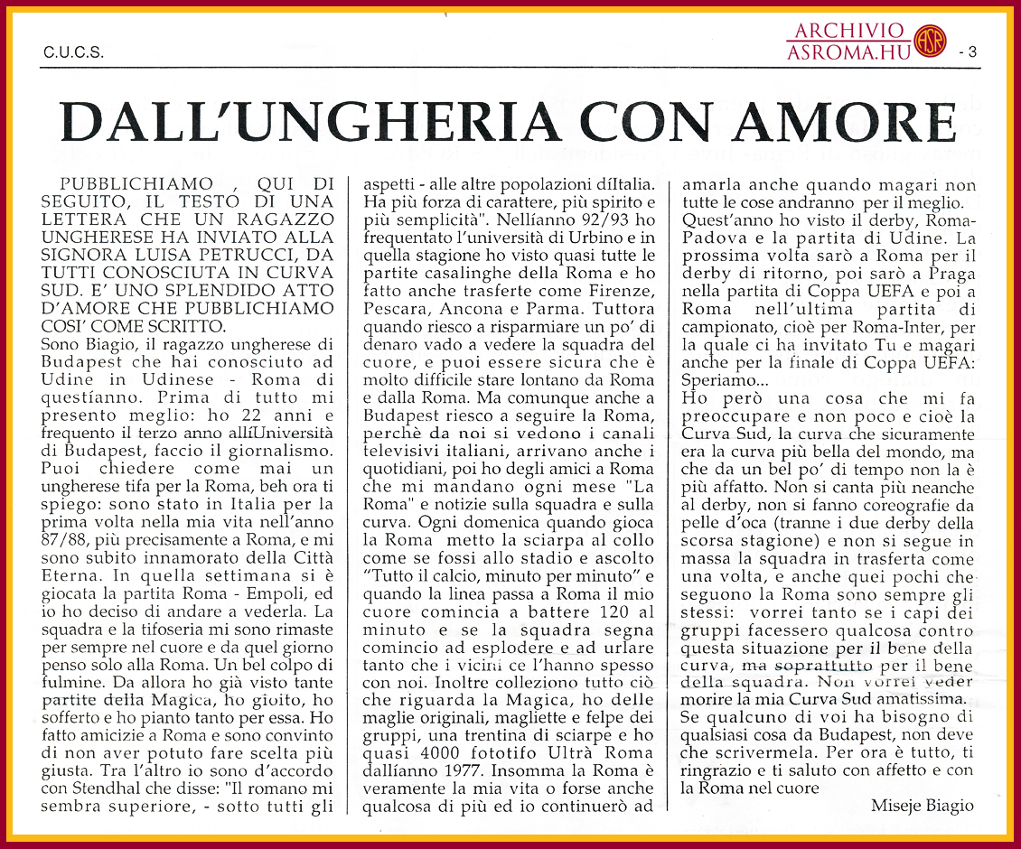 Nem volt visszaút, Róma, az AS Roma és én összekötöttük az életünket. 1989-ben még nem lehetett olasz újságokat kapni Budapesten, csak a L’Unitá című kommunista napilapot. A sportrovata egészen komoly és színvonalas volt, a hétfői lapszámokban sok oldalon keresztül foglalkoztak a bajnoki mérkőzésekkel, egy-egy nagyobb mérkőzésről 2 oldalon is beszámoltak. 1990-ig ezt az újságot vásároltam és vágtam ki belőle mindig az AS Romával foglalkozó cikkeket. Közben újabb Roma mérkőzések, az első levelezések a La Roma és a Supertifo újságnak köszönhetően más Roma szurkolókkal. Érettségi után pedig irány a középkori olasz kisváros, Urbino. Itt járhattam egyetemre, innen meg Róma még közelebb volt. Az 1992/93-as szezon nem volt igazán emlékezetes az eredmények miatt, nekem mégis felejthetetlen marad. Az első idegenbeli mérkőzések, első idegenbeli utazások, várótermekben töltött éjszakák Roma sállal a nyakamban. Utána újra Budapesten, egyetemi évek alatt is vártam mindig augusztusban a sorsolást, mikor lehet elmenni Rómába 2 hétre, ami alatt a legtöbb bajnoki és kupameccset lehet megnézni. Mikor kell a derbire utaznom, milyen meccsek lesznek, amikor az egyetemen éppen szünet lesz. A La Roma újságokat már rendszeresen vásároltam, 1996-ban pedig a Riccardo Viola nevével fémjelzett kiadó jelentetett meg több könyvet az AS Roma történetével, ezek voltak az első AS Romával kapcsolatos könyveim.
